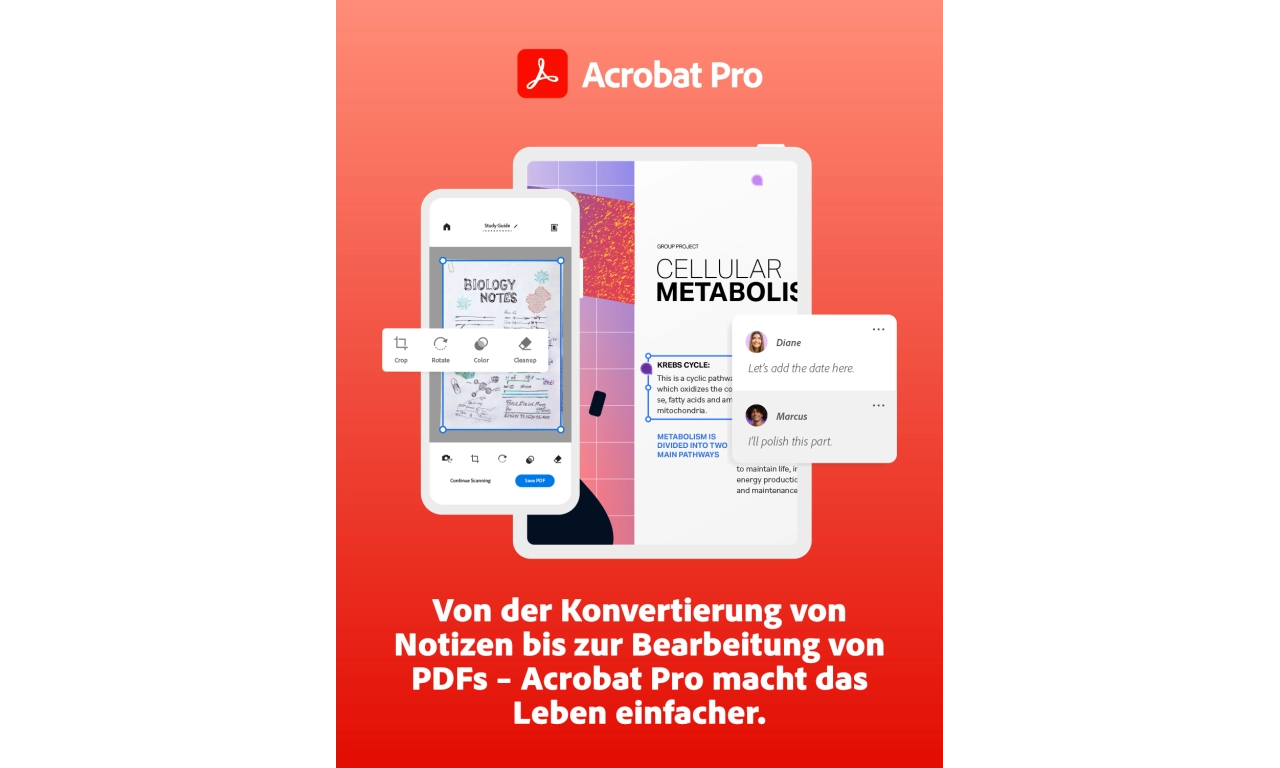 Acrobat Pro ist die professionelle Version des kostenlosen Programms Adobe Acrobat Reader. Acrobat Pro hat viel mehr Funktionen. Sie können PDFs bearbeiten, Dateien zusammenführen, Kommentare hinzufügen, Dokumente digital signieren, Scans in bearbeitbaren Text umwandeln und sie mit anderen teilen. Und das ist nur eine winzige Auswahl der vielen Möglichkeiten.