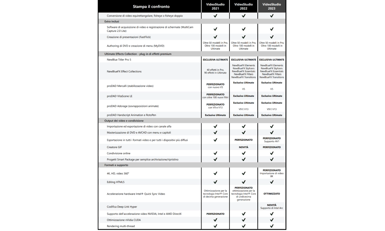 VideoStudio continua a seguire i formati più recenti per mantenere il supporto per tutti i tipi di file e i dispositivi più diffusi. Quando il video è pronto per essere condiviso, è possibile convertirlo in uno dei formati più diffusi per visualizzarlo sul dispositivo preferito, caricarlo direttamente su YouTube o esportarlo su disco. VideoStudio supporta iPad, iPhone, iPod touch e Sony PSP/PS4, smartphone Windows e Android e altro ancora. I video sono ottimizzati per il sito scelto, in modo da non rischiare mai una perdita di qualità. VideoStudio 2023 vi garantisce tutto il supporto necessario per creare video che sarete orgogliosi di condividere sulla vostra piattaforma preferita.