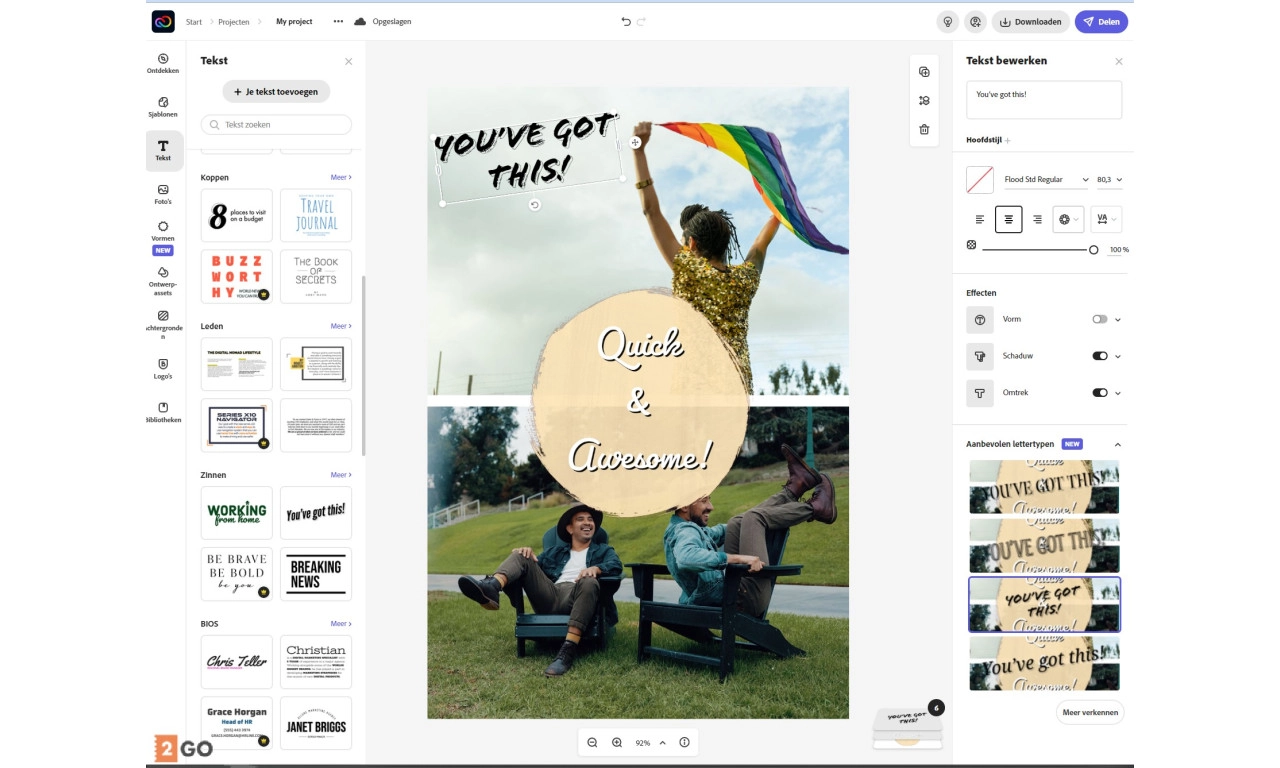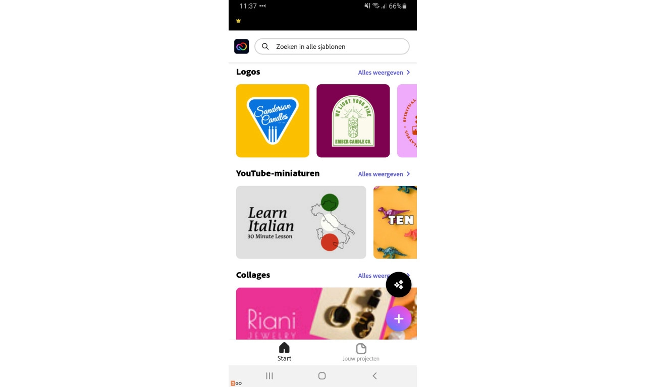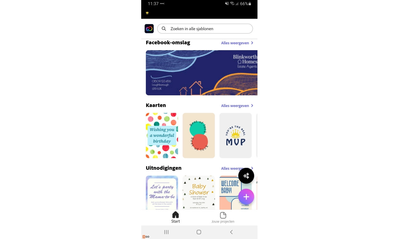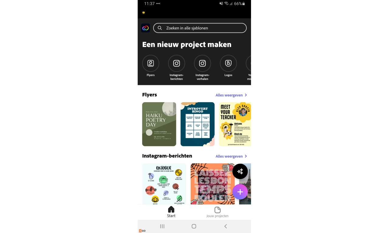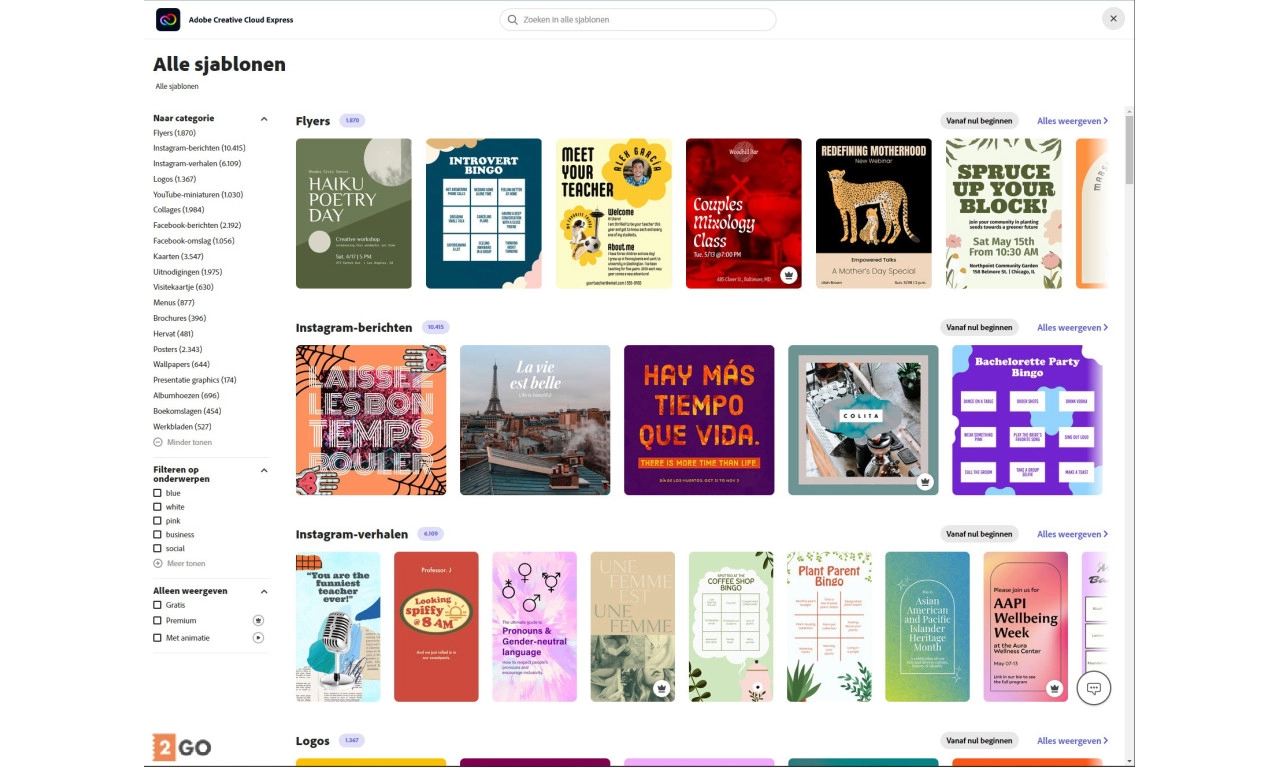 Adobe Express Premium maakt het je makkelijk met duizenden sjablonen die je snel op weg helpen. Rangschik de sjablonen op categorie of onderwerp en vind daardoor snel wat je zoekt. Ieder sjabloon kun je helemaal naar jouw wensen aanpassen. Meer dan 20.000 lettertypes en afbeeldingen staan tot je beschikking en Adobe Express Premium komt met handige suggesties waardoor je supersnel een indrukwekkend ontwerp klaar hebt. Creëer films, design flyers, posters, berichten voor social media en verbazingwekkend mooie presentaties. Je doet het in een handomdraai met Adobe Express.